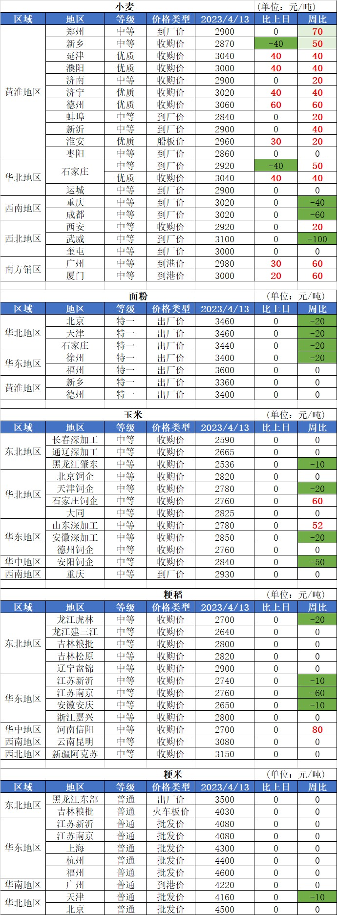 1、4月13日,小麥在經(jīng)過近一周的上漲后再次迎來較大范圍下跌,跌幅在1分左右;本周中儲糧競價銷售投放小麥超過90萬噸,之前兩周周度總投放量數(shù)據(jù)分別為17萬噸和13萬噸。