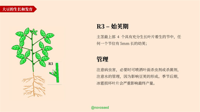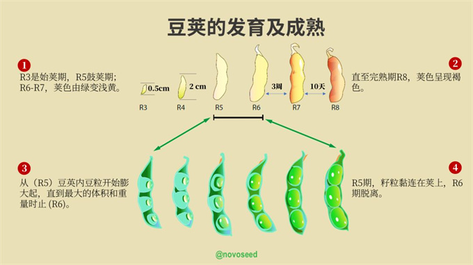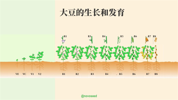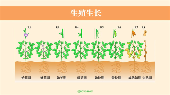 大豆的整個生長過程分 3 個生育階段和 6 個生育時期。分別為:營養(yǎng)生長階段、營養(yǎng)生長和生殖生長并進階段和生殖生長階段;種子萌發(fā)期、幼苗期、分枝期、開花期、結莢鼓粒期和成熟期。