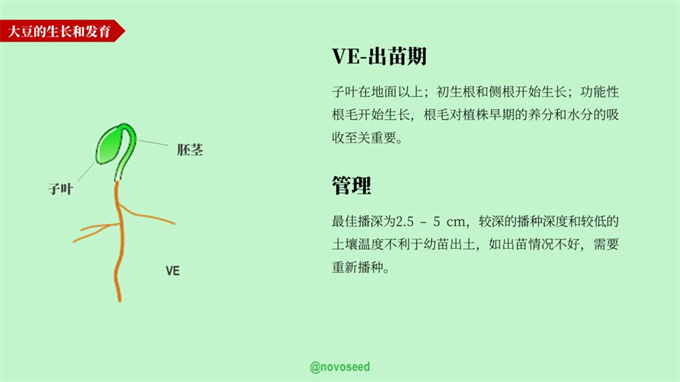 胚根首先從胚珠珠孔伸出,當胚根伸長到與種子等長時稱發(fā)芽。胚軸伸長,種皮脫落,子葉隨下胚軸伸長露出土面,當子葉展開時稱出苗。條件適宜,播種后4—6d黃豆即可出苗。田間半數(shù)以上子葉出土即為出苗期。