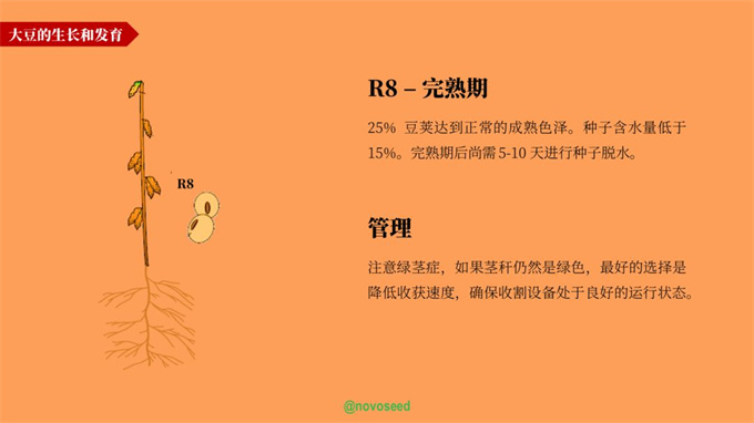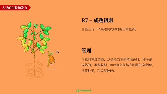 葉片受黃脫路,豆粒脫水,呈現(xiàn)品種固有性狀,這時種子含水己降至15%以下,直到搖動植株時英內有輕微響聲,即為成熟期。此時應當降低土壤水分,加速種子和植株變干,便于及時收獲,同時防止肥水過多造成貪青晚熟,影響及時收獲和倒茬。此期天氣晴朗干燥可促進成熟且有利于提高品質。