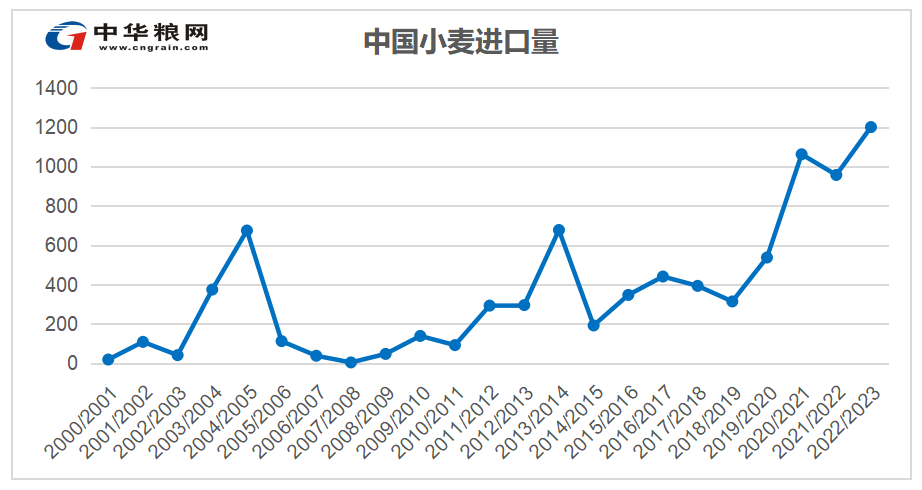 美國(guó)農(nóng)業(yè)部發(fā)布的4月份供需報(bào)告稱,2022/23年度中國(guó)將成為全球最大的小麥進(jìn)口國(guó),預(yù)計(jì)將進(jìn)口1200萬(wàn)噸小麥,創(chuàng)下1995/96年度進(jìn)口1250萬(wàn)噸小麥以來(lái)的最高進(jìn)口規(guī)模。
