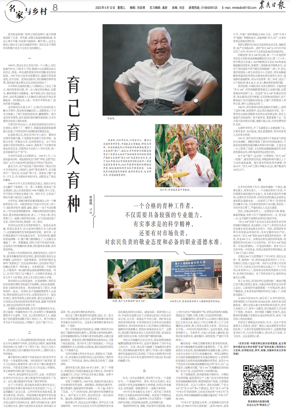 許啟鳳,1929年出生,江蘇宜興人。著名玉米遺傳育種學(xué)家,中國(guó)農(nóng)業(yè)大學(xué)教授、研究生導(dǎo)師。許啟鳳教授用18年的艱辛和執(zhí)著選育出了玉米品種“黃C”,通過(guò)20多年的努力和探索培育出了具有自主知識(shí)產(chǎn)權(quán)和獨(dú)家專利的優(yōu)質(zhì)高產(chǎn)高效玉米品種“農(nóng)大108”及其親本自交系,并于2003年獲2002年度國(guó)家科學(xué)技術(shù)進(jìn)步一等獎(jiǎng)及國(guó)家發(fā)明專利;2004年獲得何梁何利科技進(jìn)步獎(jiǎng)、聯(lián)合國(guó)國(guó)際科學(xué)與和平周榮譽(yù)獎(jiǎng)。主編或參與編著遺傳學(xué)教材、教學(xué)參考叢書(shū)、大百科全書(shū)、科普讀物等著作。