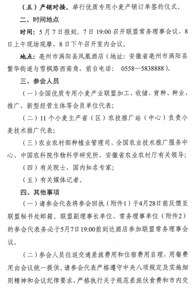 為展示我國優(yōu)質(zhì)小麥科技成果和相關產(chǎn)品,促進優(yōu)質(zhì)小麥產(chǎn)業(yè)化發(fā)展,全國優(yōu)質(zhì)專用小麥產(chǎn)業(yè)聯(lián)盟(以下稱聯(lián)盟)定于5月上旬在安徽省亳州市召開2023年全國優(yōu)質(zhì)專用小麥質(zhì)量鑒評暨產(chǎn)業(yè)發(fā)展大會?,F(xiàn)將有關事項通知如下。