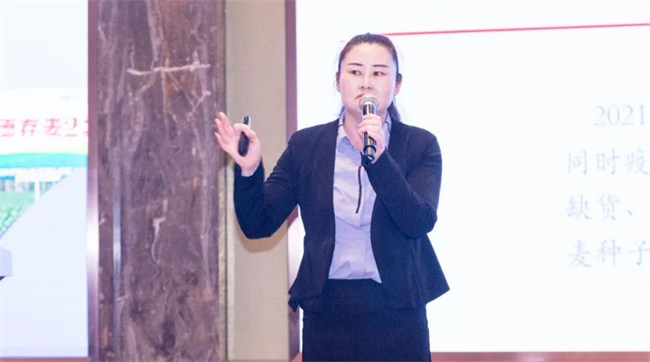 河南明科種業(yè)有限公司總經(jīng)理邱敏女士在大會上對公司發(fā)展規(guī)劃進(jìn)行分享匯報;2022年,為深耕河南小麥?zhǔn)袌?,江蘇明天種業(yè)投資,共同成立了河南明科種業(yè)有限公司。并獲取優(yōu)勢品種豐德存麥23、中麥30、揚(yáng)麥33等。經(jīng)營上不斷獲取有潛力的強(qiáng)勢品種,開發(fā)一批、成熟一批,儲備一批、穩(wěn)步強(qiáng)勁發(fā)展;以現(xiàn)有優(yōu)良品種為抓手,依托江蘇明天種業(yè)健全的小麥產(chǎn)業(yè)體系,力爭在小麥主產(chǎn)區(qū)發(fā)展成為集研發(fā)、生產(chǎn)、加工、營銷、技術(shù)服務(wù)于一體的、產(chǎn)業(yè)鏈完善、多作物種子經(jīng)營的大型種業(yè)公司。