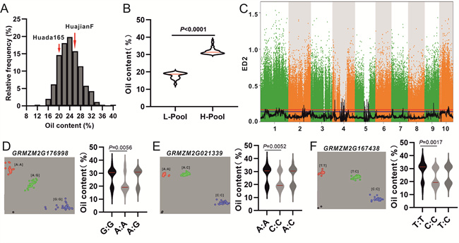 利用含油率相差6.14個百分點的兩個高油玉米構建的F2:3分離群體和BSA-seq定位技術鑒定到另外88個與玉米籽粒油含量相關的QTL,其中16個與先前報道的玉米油相關QTL重疊。RNA-seq分析發(fā)現(xiàn)兩個高油型甜玉米與兩個非高油型甜玉米間的差異表達基因顯著性富集于亞油酸代謝,氰基氨基酸代謝,谷胱甘肽代謝,丙氨酸、天冬氨酸和谷氨酸代謝以及氮代謝途徑?;谝陨戏治鼋Y果篩選BSA-seq定位區(qū)間內的高油候選基因。進一步分析發(fā)現(xiàn)候選基因GRMZM2G176998(WD40類β-螺旋重復蛋白)、GRMZG2G021339(homeobox轉錄因子)和 GRMZM2G167438(3-酮酰基-CoA合成酶)的KASP標記與分離群體中單株的籽粒含油量顯著相關;候選基因GRMZM2G099802(GDSL家族酯酶/脂肪酶)催化三酰甘油合成的最后一步,在兩個高油型甜玉米中的表達水平顯著高于兩個非高油型甜玉米(T9和SH251)。