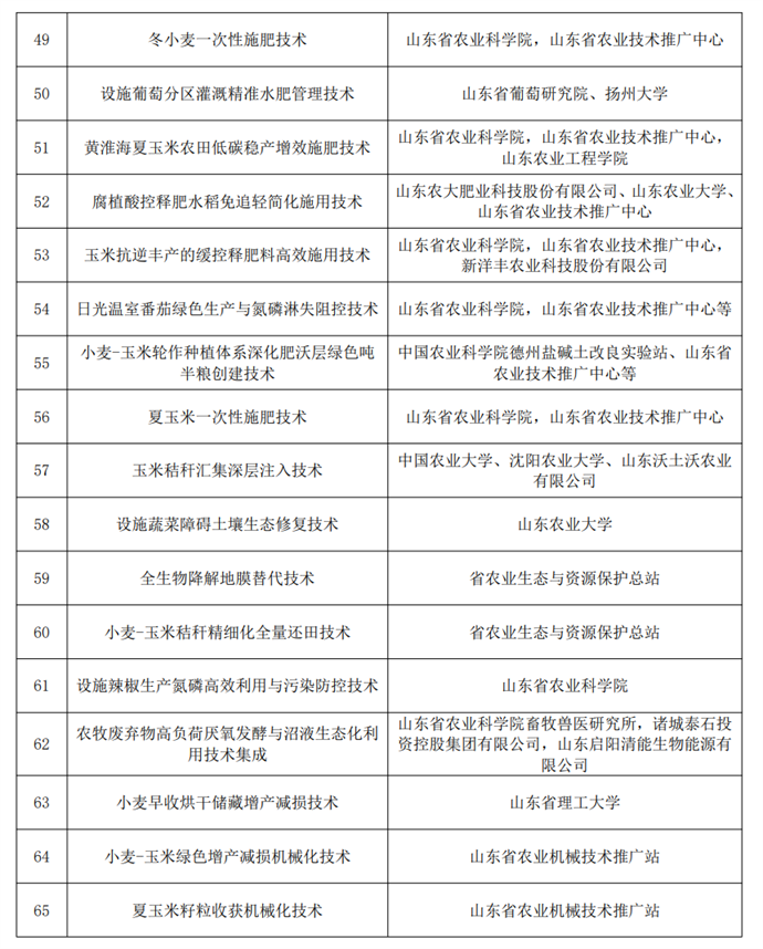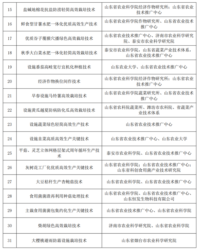 主要糧油作物主推品種包括“濟(jì)麥22”等12個(gè)小麥品種,“登海605”等9個(gè)玉米品種,“齊黃34”等5個(gè)大豆品種,“山花9號(hào)”等7個(gè)花生品種;農(nóng)業(yè)主推技術(shù)包括“冬小麥勻苗壯株抗逆高產(chǎn)栽培技術(shù)”等8項(xiàng)小麥、玉米技術(shù),“大豆一三三高產(chǎn)栽培技術(shù)”等2項(xiàng)大豆技術(shù),“丘陵旱薄地花生高產(chǎn)穩(wěn)產(chǎn)綜合配套技術(shù)”等3項(xiàng)花生技術(shù),“鮮食型甘薯水肥一體化優(yōu)質(zhì)高效生產(chǎn)技術(shù)”等2項(xiàng)雜糧技術(shù),以及多項(xiàng)棉花、蔬菜、食用菌、中藥材、水產(chǎn)養(yǎng)殖、畜牧養(yǎng)殖業(yè)技術(shù)等。