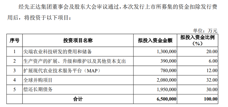 此次上市所募集資金,先正達(dá)集團(tuán)將用于五個方面。其中人民幣208億元將用于實施全球并購項目,195億元用于償還長期債務(wù),130億元用于農(nóng)業(yè)科技研發(fā)和儲備,78億元用于拓展現(xiàn)代農(nóng)業(yè)技術(shù)服務(wù)平臺(MAP),39億元用于生產(chǎn)資產(chǎn)的擴(kuò)展、升級和維護(hù)以及其他資本支出。