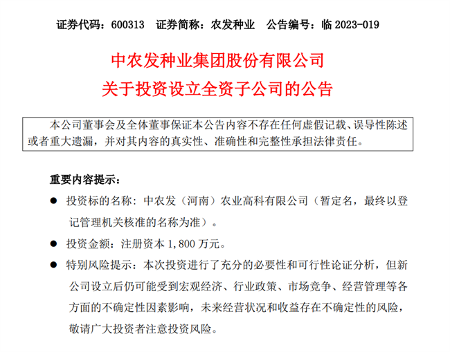 農(nóng)發(fā)種業(yè)擬1800萬設(shè)立子公司