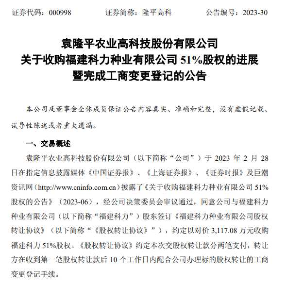 近日,隆平高科發(fā)布了《關(guān)于收購福建科力種業(yè)有限公司 51%股權(quán)的進(jìn)展暨完成工商變更登記的公告》。
