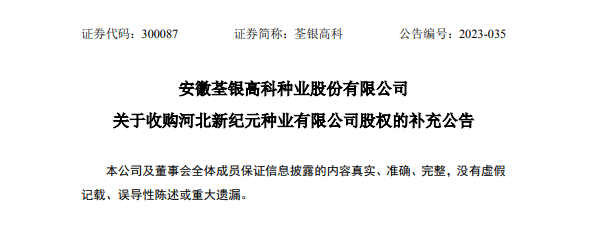 5月10日,荃銀高科發(fā)布關(guān)于收購河北新紀(jì)元種業(yè)有限公司股權(quán)的補(bǔ)充公告。