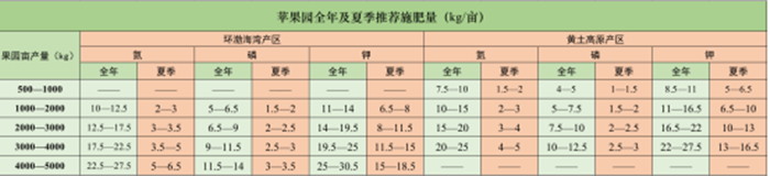 (二)科學(xué)施肥。夏季施肥分兩個(gè)階段,第一階段在套袋后(6月上中旬),以磷肥為主,配合氮鉀肥,推薦使用平衡型復(fù)合肥。第二階段在果實(shí)二次膨大期(7—9月),氮磷鉀配合施用,適當(dāng)增加鉀肥。建議根據(jù)果實(shí)大小追施氮肥、分2—3次施入。施肥方法采用放射溝法、撒施或水肥一體化。蘋果園全年及夏季推薦施肥量見下圖: