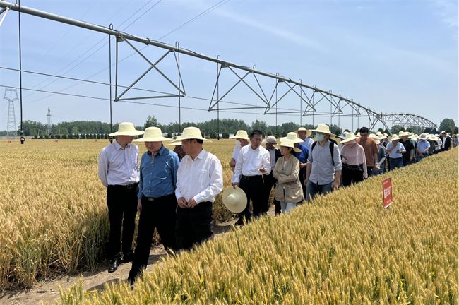 室內(nèi)會議結(jié)束后,參會人員前往宿州市農(nóng)科院小麥?zhǔn)〖壭缕贩N展示示范基地,觀摩了小麥展示評價田間現(xiàn)場。