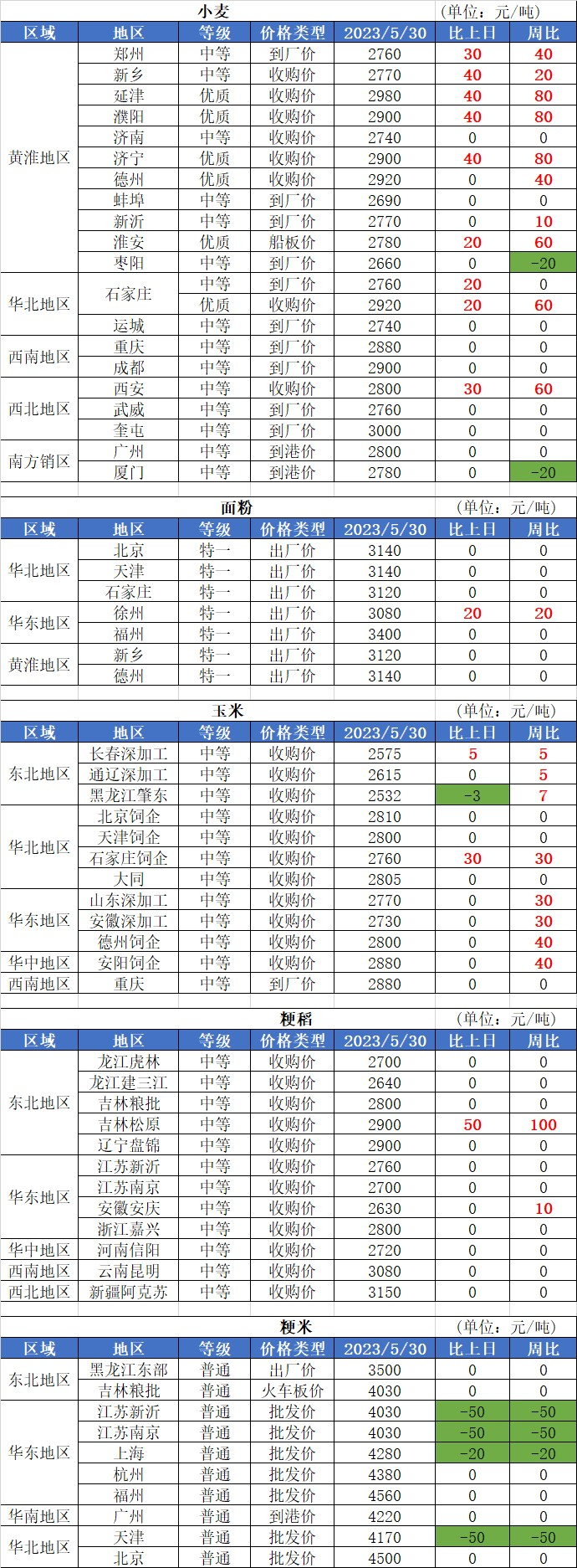 2、5月30日國(guó)內(nèi)玉米價(jià)格小幅波動(dòng),其中:南方銷區(qū)玉米價(jià)格基本穩(wěn)定,南北港口玉米價(jià)格小幅上漲,漲幅20-30元/噸,華北地區(qū)、山東地區(qū)玉米價(jià)格局部小幅下跌,跌幅10-44元/噸,東北地區(qū)玉米價(jià)格基本穩(wěn)定,局部小幅波動(dòng),變幅10元/噸。