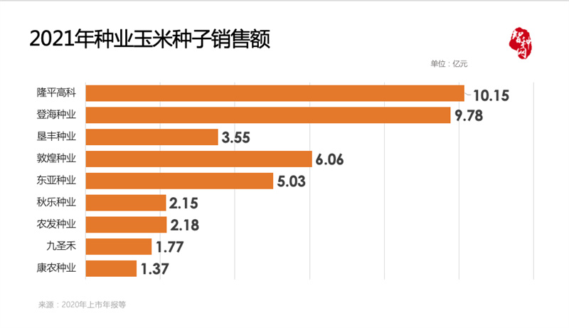 第一梯隊(duì)在7-10億左右,包括隆平高科和登海種業(yè),2021年玉米種子營(yíng)業(yè)收入分別為10.15億元和9.78億元。第二梯隊(duì)在3-7億元左右,包括敦煌種業(yè)、遼寧東亞和墾豐種業(yè),2021年玉米種子營(yíng)業(yè)收入分別為6.06億元、5.03億元和3.55億元。其中,敦煌種業(yè)和遼寧東亞近三年玉米種子營(yíng)收呈現(xiàn)強(qiáng)勢(shì)增長(zhǎng)態(tài)勢(shì),2021年增幅分別為55.39%和30.65%;墾豐種業(yè)近三年玉米種子營(yíng)收呈現(xiàn)下降態(tài)勢(shì),2021年降幅為34.77%。第三梯隊(duì)在3億元以下,包括農(nóng)發(fā)種業(yè)、秋樂(lè)種業(yè)、九圣禾和湖北康農(nóng),2021年玉米種子營(yíng)業(yè)收入分別為2.18億元、2.15億元、1.77億元和1.37億元。不過(guò)2022年隆平高科高科和登海種業(yè)玉米種子銷售額都超過(guò)10億,2022年金苑種業(yè)玉米種子銷售額2.17億,屬于第三梯隊(duì)。