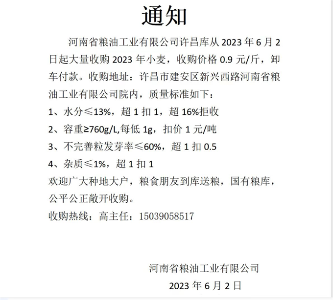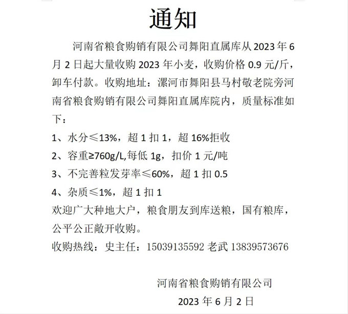 湖北老河口華糧糧食儲備庫::2023年小麥國標三等(750g/L)以上,收購價格1.35元/斤。