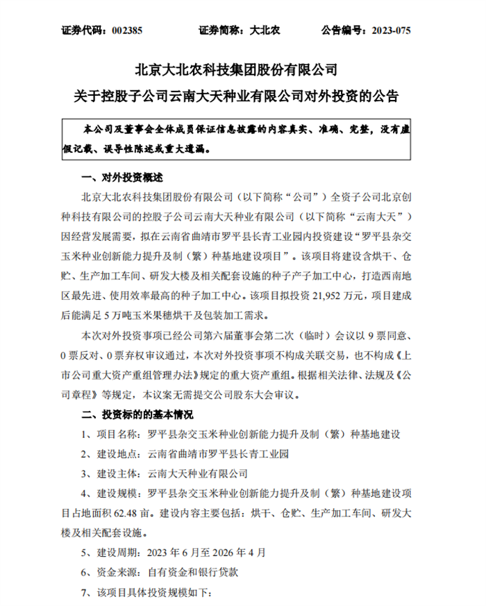 有限公司的控股子公司云南大天種業(yè)有限公司擬在云南省曲靖市羅平縣長青工業(yè)園內投資建設“羅平縣雜交