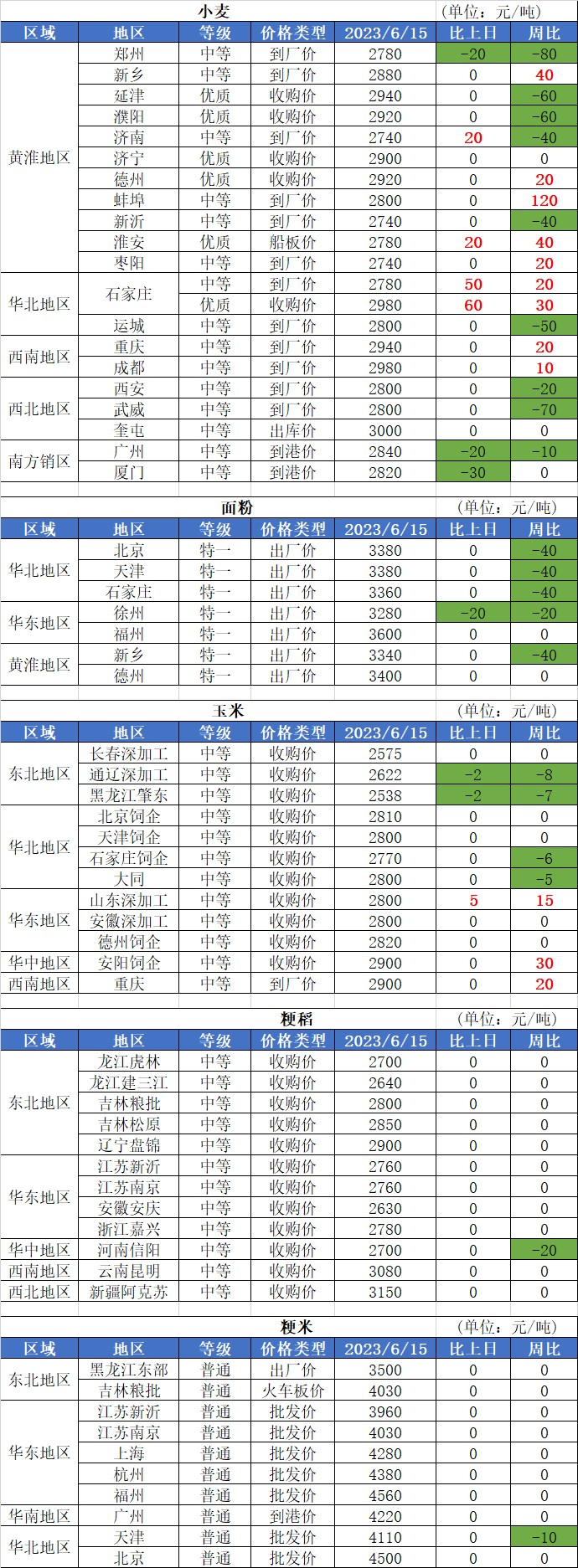 2、6月15日國內(nèi)玉米價格小幅漲跌,其中:南北港口、南方銷區(qū)玉米價格基本穩(wěn)定;東北地區(qū)玉米價格基本穩(wěn)定,局部價格小幅漲跌,變化幅度10元/噸左右;山東地區(qū)、華北地區(qū)玉米價格基本穩(wěn)定,局部價格小幅上漲,漲幅6-30元/噸。