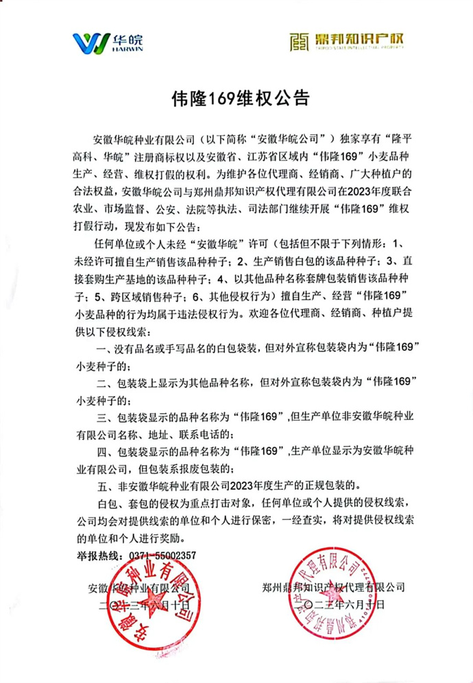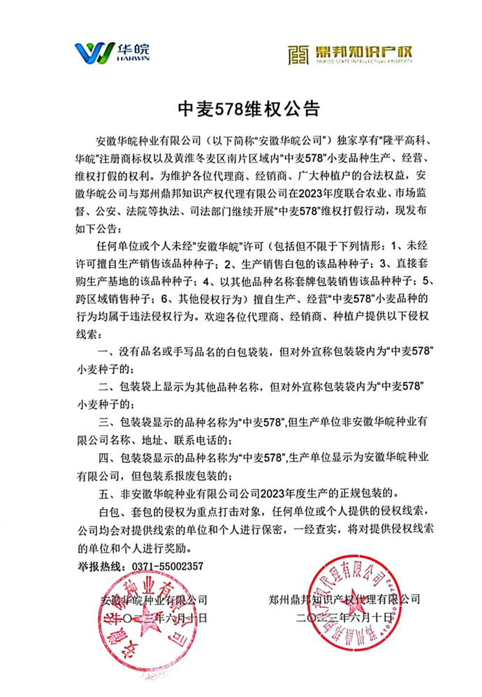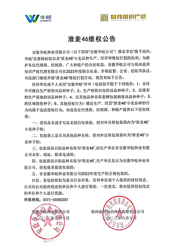 目前,安徽華皖委托知識產(chǎn)權(quán)代理公司持續(xù)開展打假維權(quán)行動,并發(fā)布相關(guān)小麥品種維權(quán)公告,用法律武器維護自身合法權(quán)益,助力小麥種子市場健康發(fā)展。