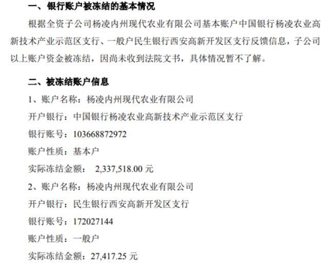 大唐種業(yè)(839045)近日發(fā)布公告,根據(jù)全資子公司楊凌內(nèi)州現(xiàn)代農(nóng)業(yè)有限公司基本賬戶中國(guó)銀行楊凌農(nóng)業(yè)高新技術(shù)產(chǎn)業(yè)示范區(qū)支行、一般戶民生銀行西安高新開發(fā)區(qū)支行反饋信息,子公司以上賬戶資金被凍結(jié),因尚未收到法院文書,具體情況暫不了解。