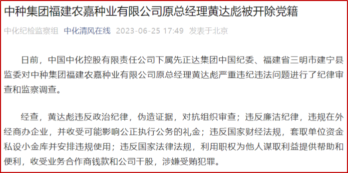 據(jù)中國(guó)中化集團(tuán)反腐宣傳平臺(tái)6月25日消息,日前,中國(guó)中化控股有限責(zé)任公司下屬先正達(dá)集團(tuán)中國(guó)紀(jì)委、福建省三明市建寧縣監(jiān)委對(duì)中種集團(tuán)福建農(nóng)嘉種業(yè)有限公司原總經(jīng)理黃達(dá)彪嚴(yán)重違紀(jì)違法問題進(jìn)行了紀(jì)律審查和監(jiān)察調(diào)查。