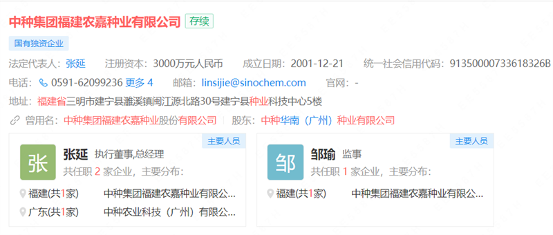 企查查顯示,中種集團(tuán)福建農(nóng)嘉種業(yè)有限公司成立于2001年,注冊(cè)資本為3000萬元人民幣,公司地址位于福建省建寧縣,公司股東為中種華南(廣州)種業(yè)有限公司。