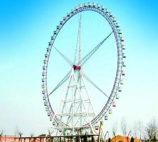 世紀歡樂園摩天輪是目前為止亞洲最高的摩天輪,吊艙有56個,重達數(shù)千噸。在被鄭州市列入夜景照明工程后,近日,鄭州市市政部門投資600多萬元對其進行了精心設計,在該摩天輪上安裝了裝飾燈。該燈由2000多根彩色燈管圍繞直徑90多米的摩天輪組成,中間的六根菱形支柱也被變幻的燈管裝飾,無論是從高度還是燈管的長度,該燈都堪稱“亞洲第一燈”。