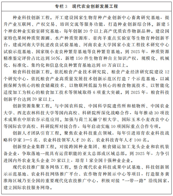 統(tǒng)籌建設(shè)種業(yè)關(guān)鍵領(lǐng)域重大創(chuàng)新平臺。加快建設(shè)河南農(nóng)業(yè)大學(xué)國家“2011計劃”現(xiàn)代農(nóng)業(yè)科技研究實驗基地、河南大學(xué)生物學(xué)一流學(xué)科現(xiàn)代農(nóng)業(yè)科技試驗基地,籌建歐洲農(nóng)業(yè)物理(新鄉(xiāng))研究院等科研機構(gòu)和重大平臺,形成世界一流的種業(yè)科技基礎(chǔ)設(shè)施集群和科研試驗示范基地集群。