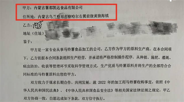 事情的起因全源于權(quán)貴那一點(diǎn)“小心思”。海瑞的父親權(quán)貴(化名)原本是烏蘭察布市察哈爾右翼中旗一名普普通通的農(nóng)民,一直以種土豆為生。2022年4月12日,正值春耕,權(quán)貴與內(nèi)蒙古薯都裕農(nóng)種業(yè)科技有限公司(以下簡稱薯都裕農(nóng))和內(nèi)蒙古薯都凱達(dá)食品有限公司(以下簡稱薯都凱達(dá))分別簽訂了農(nóng)資購買合同和馬鈴薯收購合同。