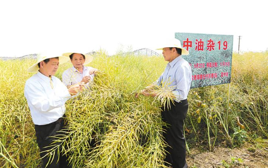 傅廷棟、王漢中、官春云三位院士在田間查看“中油雜19”