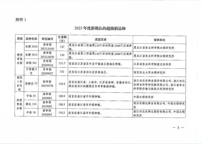 根據(jù)《超級(jí)稻品種確認(rèn)辦法》(農(nóng)辦 科〔2008 〕38 號(hào)),經(jīng)各地推薦和專家評(píng)審,現(xiàn)確認(rèn)?粳3010、?粳3013、泗稻301、寧香粳9 號(hào)、浙粳優(yōu)77、中組53、舜達(dá) 135、中組 18、瑋兩優(yōu)861 2、瑋兩優(yōu)7713、隆兩優(yōu)8612、?香 優(yōu)19 香、品香優(yōu)美珍、品香優(yōu)秱珍、川康優(yōu)絲苗、泰優(yōu)808 等 16 個(gè)品種為2023 年度超級(jí)稻品種(附件1)。