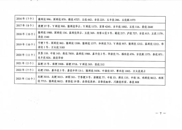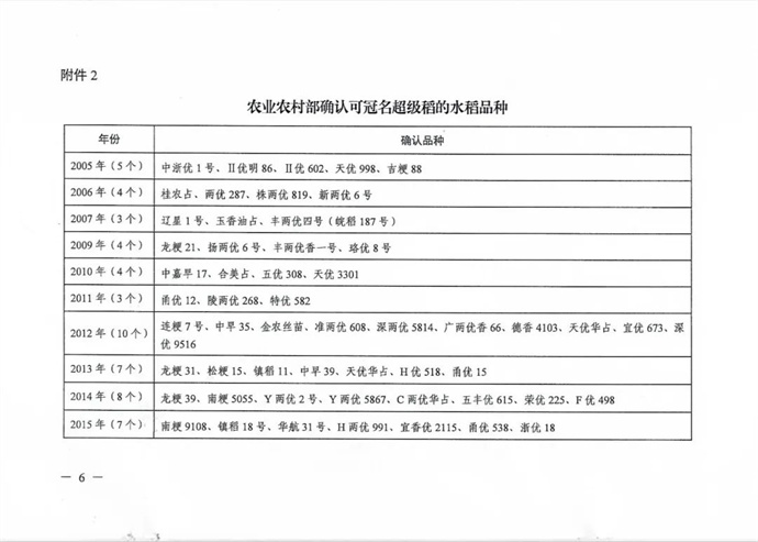 同時(shí),因推廣面積未達(dá)要求,揚(yáng)粳4227、寧粳4 號(hào)、Y兩優(yōu)087、天優(yōu)3618、 中 9 優(yōu) 8 0 1 2 、 武 運(yùn) 粳 2 7 號(hào)、 兩 優(yōu) 0 3 8 、 廣 兩 優(yōu) 2 7 2 、 兩 優(yōu) 6 號(hào)、 兩 優(yōu) 6 1 6 、 盛 泰 優(yōu) 7 2 2 、 內(nèi) 5 優(yōu) 8 0 1 5 、 揚(yáng) 育 粳 2 號(hào)、 深 優(yōu) 1 0 2 9 、春 優(yōu) 8 4 、 吉粳 5 1 1 、 南 粳 5 2 、 豐 田 優(yōu) 5 5 3 、 南 粳 0 2 1 2 、 深 兩 優(yōu) 8386 等20 個(gè)品種不再冠名超級(jí)稻。