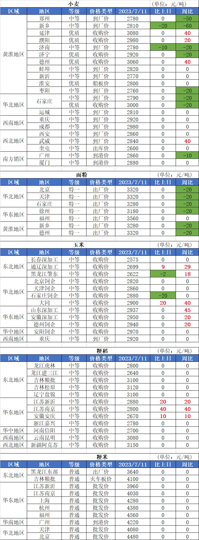 1、7月11日小麥價(jià)格漲跌互現(xiàn),變化幅度0.5-1.0分/斤,主產(chǎn)區(qū)制粉企業(yè)收購價(jià)格范圍在1.37-1.48元/斤。
