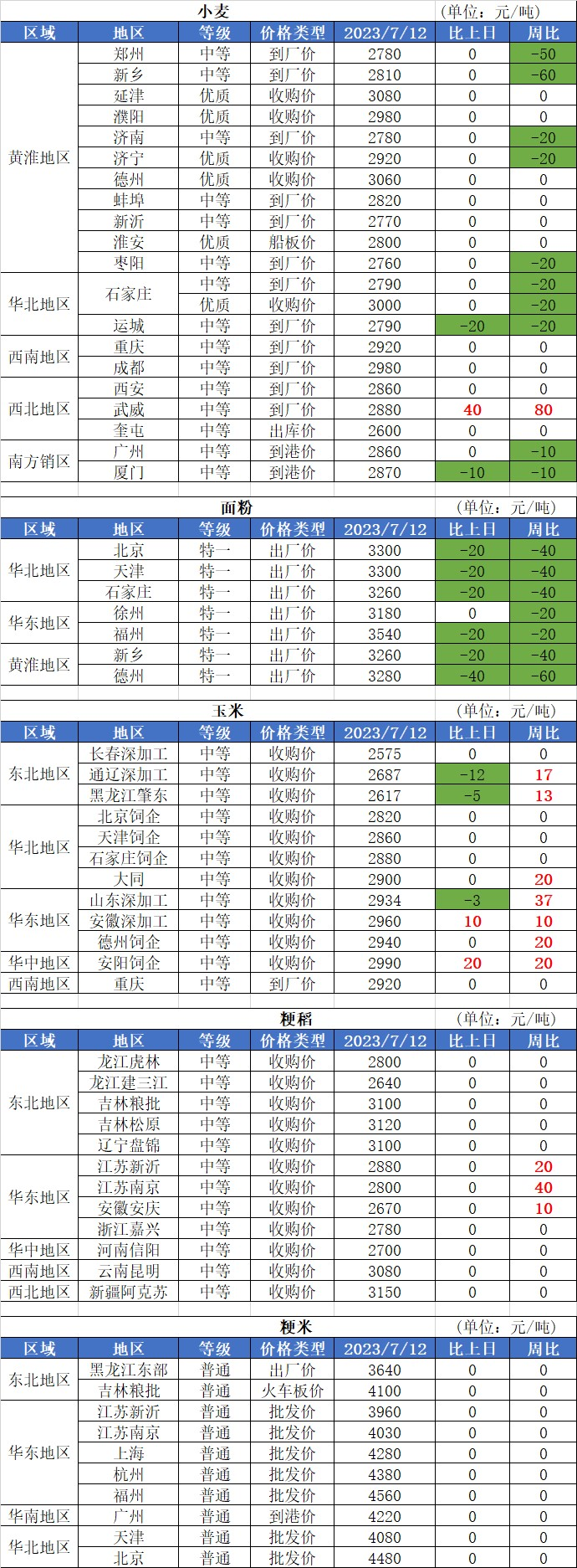 2、7月12日國內(nèi)玉米價格小幅震蕩,其中:南北港口玉米價格基本穩(wěn)定;華北地區(qū)、東北地區(qū)、山東地區(qū)玉米價格基本穩(wěn)定,局部價格小幅下跌,跌幅4-20元/噸;南方銷區(qū)玉米價格基本穩(wěn)定,局部價格上漲,漲幅50元/噸。