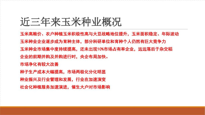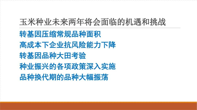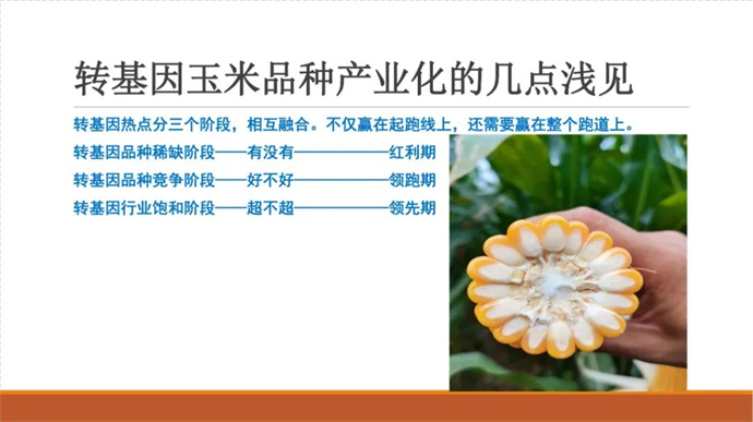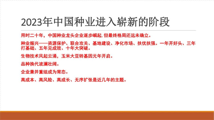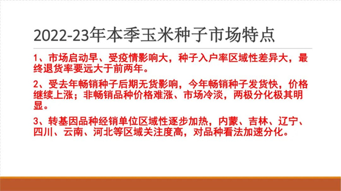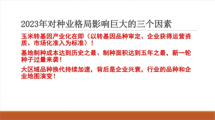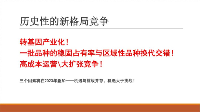 2022年-2023年度,我國玉米進入一個嶄新的周期,市場和行業(yè)形勢發(fā)生了巨大變化:知識產(chǎn)權(quán)保護進入加強期,市場進入嚴管期,政策進入利好期,品種進入換代期,企業(yè)進入加快淘汰期,玉米轉(zhuǎn)基因品種產(chǎn)業(yè)化進入開放前期,行業(yè)即將進入巨變期,再加之后疫情時代的挫折與迷茫,我們迫切需要專業(yè)的指導和引領。