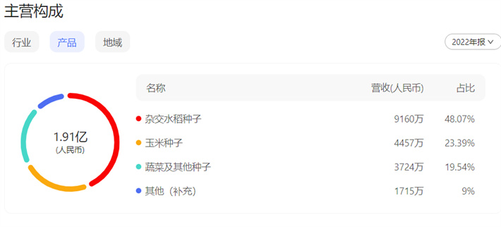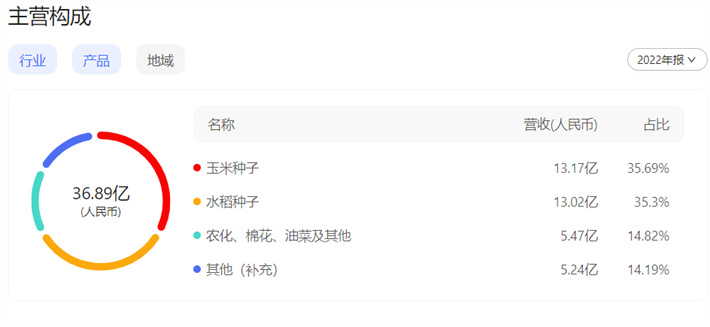 2022年?duì)I收36.89億元,歸母凈利潤-8.76億元。2023年1季度歸母凈利潤1.71億元。2022年公司玉米種子收入13.17億元,水稻種子收入13.02億元。