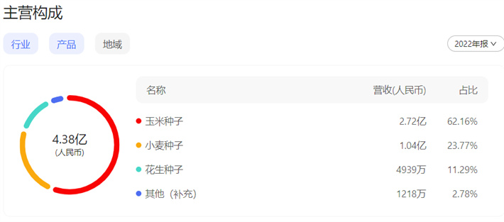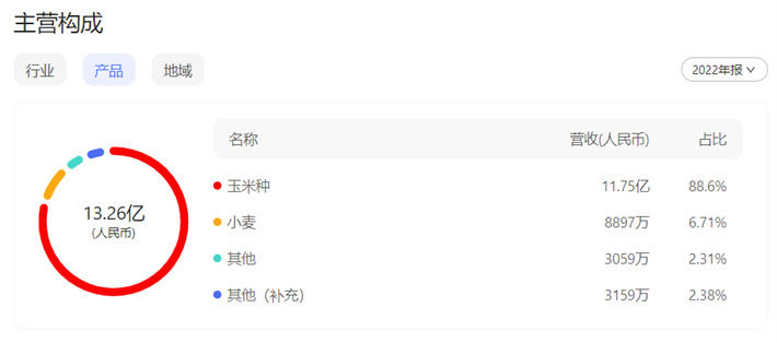 2022年?duì)I收13.26億元,歸母凈利潤2.53億元。其中玉米種子銷售額11.75億元,占比88.6%。2023年1季度歸母凈利潤0.45億元。