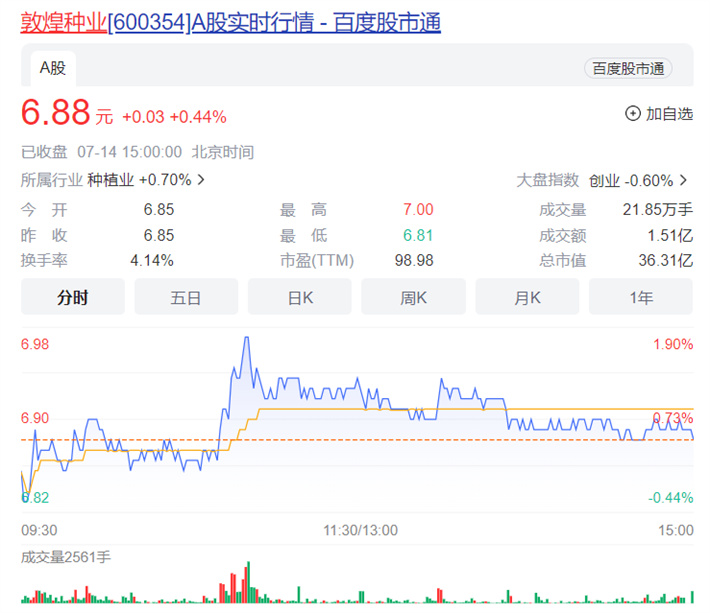 甘肅省敦煌種業(yè)集團(tuán)股份有限公司2004年1月在上海證券交易所上市,目前市值36.31億元。種業(yè)是公司主營板塊,近兩年食品、棉花等板塊營收占比有所下降。