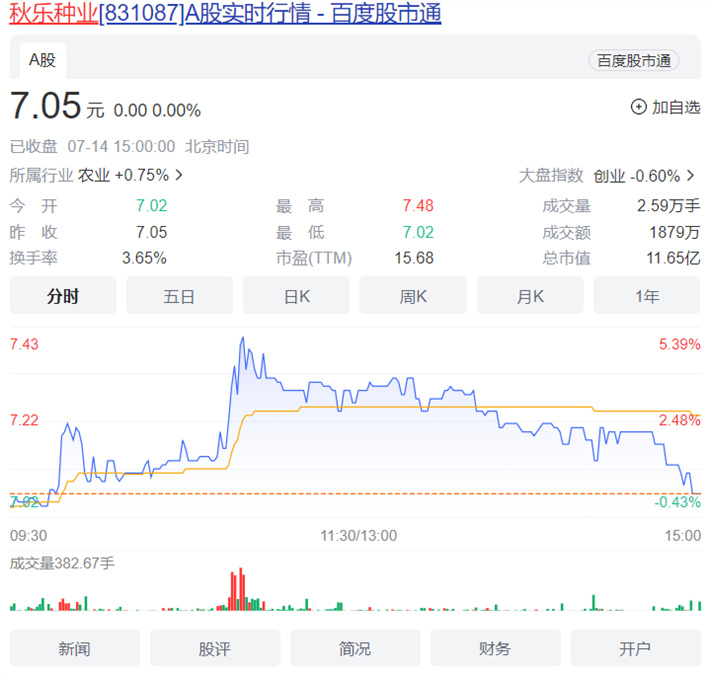 河南秋樂種業(yè)科技股份有限公司2022年12月在北京證券交易所上市,目前市值11.65億元。公司種業(yè)板塊涵蓋玉米、小麥、花生。2022年?duì)I收4.38億元,歸母凈利潤0.62億元。2023年1季度歸母凈利潤0.1億元。