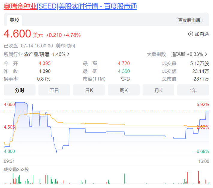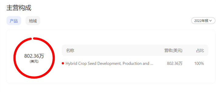 北京奧瑞金種業(yè)股份有限公司2005年在美國納斯達(dá)克交易所上市,目前市值2871萬美元。2022年?duì)I收802.36萬美元。