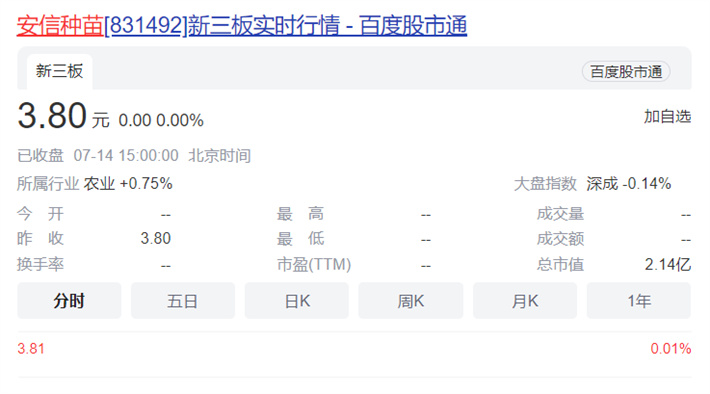 山東安信種苗股份有限公司2014年12月掛牌新三板,目前市值2.14億元。公司主營業(yè)務(wù)為種苗繁育等。20222年?duì)I業(yè)收入1.26億元,歸母凈利潤2298.54萬元。