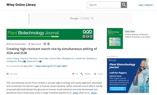 2023年5月,《植物生物技術(shù)雜志》期刊在線發(fā)表揚(yáng)州大學(xué)的研究成果。研究人員利用CRISPR/Cas9技術(shù)對SS3a和SS3b進(jìn)行了共敲除,并經(jīng)過多代篩選獲得了多個(gè)單突(ss3a、ss3b)和雙突(ss3a—ss3b)純合系,揭示了SS3a和SS3b在水稻葉片和胚乳淀粉合成以及稻米RS形成中的協(xié)同作用機(jī)制,創(chuàng)制了RS含量高達(dá)9.54%—9.73%(野生型0.58%)、消化速率顯著降低的營養(yǎng)健康水稻新種質(zhì),為培育高RS含量水稻新品種提供了新策略,并有助于進(jìn)一步闡明谷物中淀粉合成相關(guān)基因的功能。