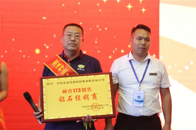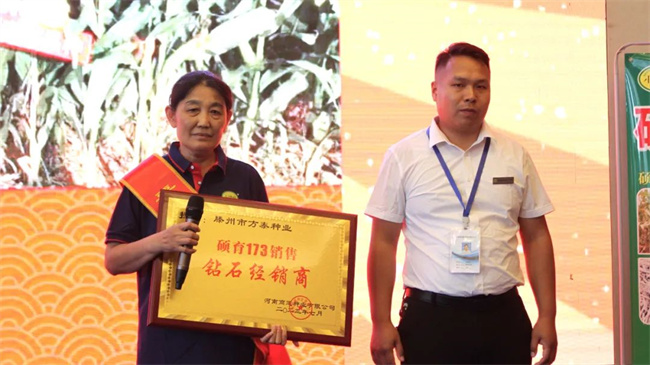 為激勵更多的銷售伙伴向先進學習,商道種業(yè)依據(jù)碩育173在2022—2023年度銷售業(yè)績,共設(shè)立卓越貢獻獎、杰出貢獻獎、優(yōu)秀貢獻獎三個獎項,對優(yōu)秀經(jīng)銷商予以表彰。六位獲得卓越貢獻獎代表分別做交流發(fā)言。從他們言語中由衷地表達了對抗倒性好,高產(chǎn)穩(wěn)產(chǎn)、品質(zhì)優(yōu)的碩育173喜愛和認可,并號召在場經(jīng)銷商團結(jié)一致,齊頭并進,共贏共享碩育173玉米事業(yè)美好明天!