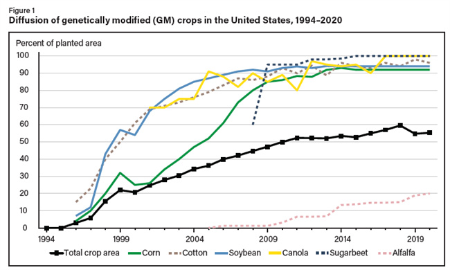 生物技術(shù)帶來(lái)的技術(shù)機(jī)遇和知識(shí)產(chǎn)權(quán)的變化激勵(lì)私人投資種子生物技術(shù)研發(fā)。生物技術(shù)帶來(lái)的技術(shù)機(jī)遇和知識(shí)產(chǎn)權(quán)的變化刺激了私人對(duì)種子生物技術(shù)研發(fā)的投 資,也導(dǎo)致了種子行業(yè)的重組,因?yàn)閾碛星熬翱春玫霓D(zhuǎn)基因性狀的公司收購(gòu)或兼并了在種 子遺傳學(xué)和營(yíng)銷網(wǎng)絡(luò)方面擁有資產(chǎn)的公司。20 世紀(jì) 90 年代末,美國(guó)引進(jìn)了轉(zhuǎn)基因玉米、大豆和棉花品種,并在幾年內(nèi)成為農(nóng)民的主要種子選擇(圖 1)。后來(lái),轉(zhuǎn)基因品種被廣泛用于油菜和甜菜。轉(zhuǎn)基因品種開始在紫花苜蓿中推廣,并在馬鈴薯、木瓜、南瓜和蘋果中進(jìn)行了小規(guī)模的商業(yè)種植(國(guó)際農(nóng)業(yè)生物技術(shù)應(yīng)用服務(wù)組織 [ISAAA],2021 年)。到 2020 年,美國(guó)收獲的耕地總面積中約有 55% 種植了至少具有一種轉(zhuǎn)基因性狀的品種。最普遍的轉(zhuǎn)基因性狀是耐除草劑性和抗蟲性。