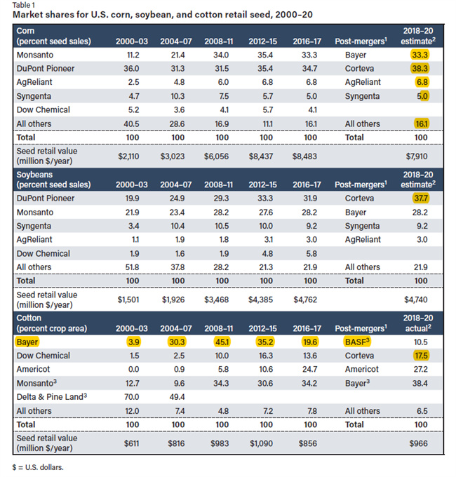 有關(guān)其他作物零售種子市場(chǎng)份額的信息主要來(lái)自私營(yíng)部門。表 1 顯示了 2000 年以來(lái)美國(guó)玉米、大豆和棉花種子市場(chǎng)集中度的變化情況,包括 2018-19 年陶氏化學(xué)-杜邦和拜耳-孟山都合并可能產(chǎn)生的影響。2000-20 年間,玉米和大豆的四家公司集中率(CR4)呈上升趨勢(shì),到 2016-17 年,玉米和大豆的四家公司集中率分別達(dá)到 80 和 75(合并后可能會(huì)再次上升)。棉籽市場(chǎng)的 CR4 甚至更高,2018-20 年達(dá)到 94,盡管 2007 年孟山都收購(gòu)三角洲和松樹地公司后,任何一家公司的主導(dǎo)地位都有所下降。