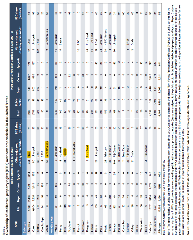 轉(zhuǎn)基因性狀的市場(chǎng)被認(rèn)為是高度集中的,盡管公開信息非常有限。孟山都公司是早期開發(fā)轉(zhuǎn)基因作物的領(lǐng)軍企業(yè),在 20 世紀(jì) 90 年代和 2000 年代確立了在轉(zhuǎn)基因性狀領(lǐng)域的主導(dǎo)地位。到 2009 年,美國(guó) 95% 的大豆種植面積、81% 的玉米種植面積和 79% 的棉花種植面積都使用了孟山都公司擁有或授權(quán)使用的轉(zhuǎn)基因性狀(Moschini,2010 年)。轉(zhuǎn)基因性狀的許可和交叉許可在行業(yè)內(nèi)廣泛存在,一個(gè)品種可能有多個(gè)公司許可的 "疊加性狀"。雖然一些轉(zhuǎn)基因性狀的早期專利已經(jīng)到期或即將到期,但尚不清楚這些性狀的非專利版本是否可用于商業(yè)用途。