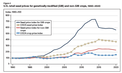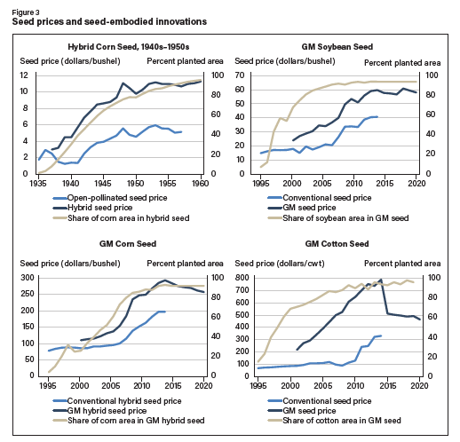 在美國(guó)種子市場(chǎng)變得更加集中的同時(shí),種子價(jià)格也大幅上漲,尤其是轉(zhuǎn)基因品種(Shi 等,2009 年,2010 年)。23 1990 年至 2020 年間,農(nóng)民購(gòu)買種子的平均價(jià)格上漲了 270%,而商品價(jià)格上漲了 56%。對(duì)于主要使用轉(zhuǎn)基因種子種植的作物(玉米、大豆和棉花),種子價(jià)格平均上漲了 463%(圖 2)。盡管成本較高,但轉(zhuǎn)基因作物品種為農(nóng)民帶來(lái)了顯著的生產(chǎn)率收益,部分原因是產(chǎn)量提高,但由于基因特征替代了其他投入,也降低了農(nóng)業(yè)生產(chǎn)成本。例如,具有抗蟲性的轉(zhuǎn)基因特征減少了施用殺蟲劑的需要,具有耐除草劑性狀的轉(zhuǎn)基因特征替代了機(jī)械耕作,減少了以前用于除草的勞動(dòng)力、機(jī)械和燃料。生產(chǎn)率的提高似乎足以彌補(bǔ)種子成本的增加。據(jù) Ciliberto 等人(2019 年)估計(jì),玉米和大豆的轉(zhuǎn)基因性狀每年為美國(guó)經(jīng)濟(jì)帶來(lái)的附加值超過(guò) 50 億美元,其中 44% 由農(nóng)民保留,56% 流向種子公司。對(duì)全球轉(zhuǎn)基因性狀的經(jīng)濟(jì)影響研究進(jìn)行的薈萃分析也得出了類似的結(jié)論:盡管轉(zhuǎn)基因品種的種子成本較高,但采用轉(zhuǎn)基因品種給農(nóng)民帶來(lái)了可觀的利潤(rùn)(Klümper 和 Qaim,2014 年)。