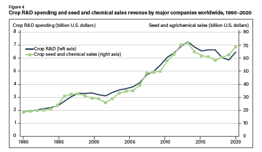這兩項(xiàng)創(chuàng)新都大大提高了農(nóng)業(yè)生產(chǎn)率和利潤(rùn)率,盡管種子成本較高,但農(nóng)民很快就采用了它們。此外,公司能夠收取的較高種子價(jià)格支持了更多的研發(fā)投資。在引進(jìn)轉(zhuǎn)基因品種的同時(shí),七家最大的農(nóng)業(yè)公司在作物改良方面的研發(fā)總支出從 1990 年的不足 20 億美元增加到 2014 年的超過(guò) 70 億美元,與公司圖 4)。自 2014 年以來(lái),這些公司的作物研發(fā)支出和收入都有所下降,直到 2021 年才收復(fù)一些失地。作為一個(gè)整體,這些公司在研發(fā)方面的投入一直占其農(nóng)業(yè)收入的 10%左右。
