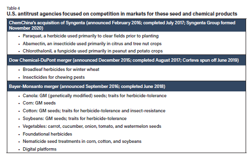 種子行業(yè)結(jié)構(gòu)變化的主要驅(qū)動(dòng)力是生物技術(shù)在作物農(nóng)業(yè)中的應(yīng)用。目前,少數(shù)跨國(guó)種子化學(xué)品公司主導(dǎo)著美國(guó)和全球的轉(zhuǎn)基因種子市場(chǎng),而非轉(zhuǎn)基因作物種子市場(chǎng)則更加多樣化。這些發(fā)展對(duì)作物研發(fā)的私人投資額和種子價(jià)格產(chǎn)生了相當(dāng)大的影響,近幾十年來(lái),這兩方面的價(jià)格都大幅上漲,尤其是轉(zhuǎn)基因種子。種子價(jià)格上漲在很大程度上反映了企業(yè)從其對(duì)商業(yè)上可行的作物新品種的知識(shí)產(chǎn)權(quán)中獲得的市場(chǎng)支配力,以及企業(yè)研發(fā)投資的回報(bào)。反壟斷政策的重點(diǎn)是兼并對(duì)特定種子和化學(xué)產(chǎn)品市場(chǎng)競(jìng)爭(zhēng)的影響。反壟斷調(diào)查不僅要評(píng)估對(duì)價(jià)格的影響,還要評(píng)估對(duì)創(chuàng)新的影響--兼并是否會(huì)降低企業(yè)投資研發(fā)的積極性。在 2015-20 年一輪主要種子和農(nóng)用化學(xué)品公司之間的兼并中,對(duì)反壟斷問題的結(jié)構(gòu)性補(bǔ)救涉及將兼并公司的某些資產(chǎn)剝離給行業(yè)內(nèi)的其他競(jìng)爭(zhēng)者。
