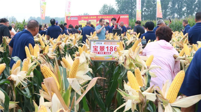 會(huì)議期間,參會(huì)代表觀摩了寶景186大田種植表現(xiàn)。一株株被剝開了苞葉,削去了果穗以上部分的寶景186玉米新品種,傲人挺立。滿眼排列整齊的果穗,像列隊(duì)的戰(zhàn)士等待著眾人的“檢閱”。每顆果穗都是棒大籽深,高低一致,一粒封頂,引來觀摩人群的陣陣圍觀,拍照留念、發(fā)短視頻、分享朋友圈絡(luò)繹不絕,猶如自帶流量的“網(wǎng)紅”,吸引了眾多觀摩代表的目光。