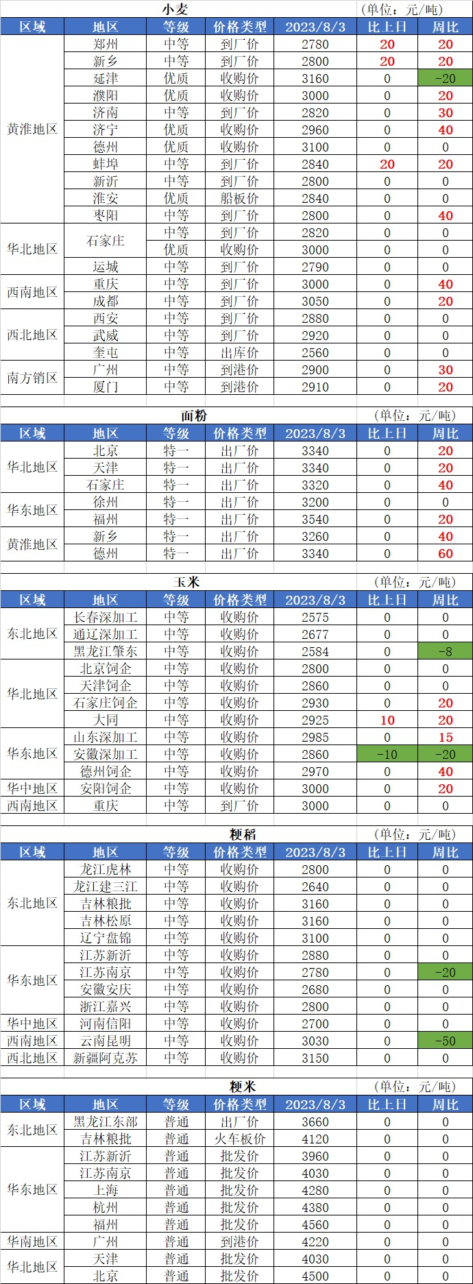 2、8月3日國(guó)內(nèi)玉米價(jià)格穩(wěn)中略跌,其中:南北港口、山東地區(qū)、華北地區(qū)、南方銷區(qū)玉米價(jià)格基本穩(wěn)定;東北地區(qū)玉米價(jià)格基本穩(wěn)定,局部?jī)r(jià)格下跌,跌幅5-12元/噸。